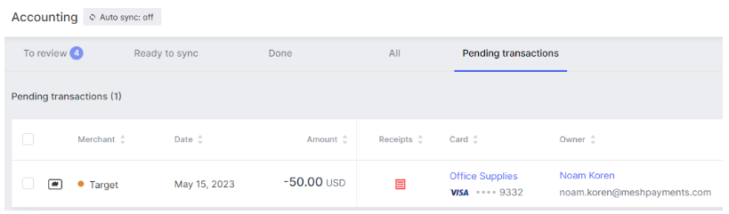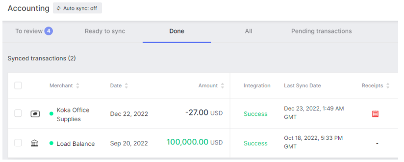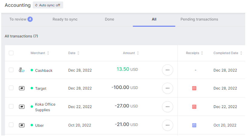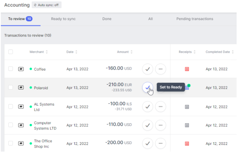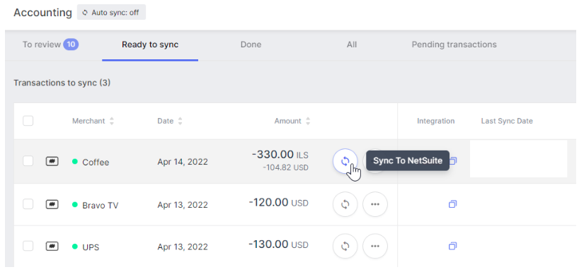 2. The Ready to Sync tab presents transactions ready to sync to the ERP. You can sync manually (e.g., one by one or a few at once) or wait for the auto-sync feature to do it. If the platform synced the transactions successfully, the transaction will ‘move’ to the All tab otherwise, the transactions will remain in the Ready to Sync tab with a relevant error message. If you mark transactions as On Hold it moves back to the To review page.