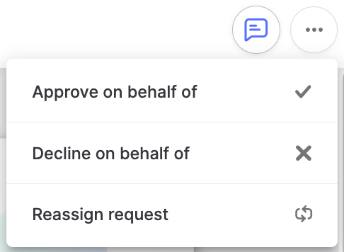Power users can take action (e.g., Approve on behalf of, Decline Approve on behalf of, or Reassign) on budgets and trips not assigned to them from the 'Pending approval' tab of the Virtual Cards and Travel pages. They can take similar actions from the 'Expense in review' tab under Transactions/Reimbursements.