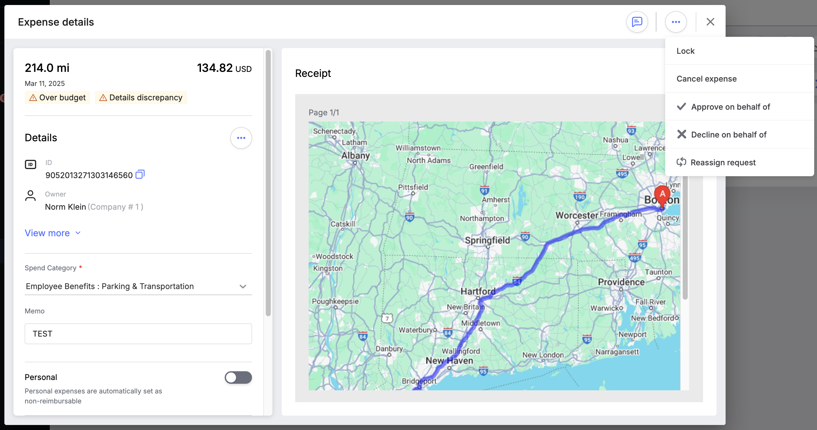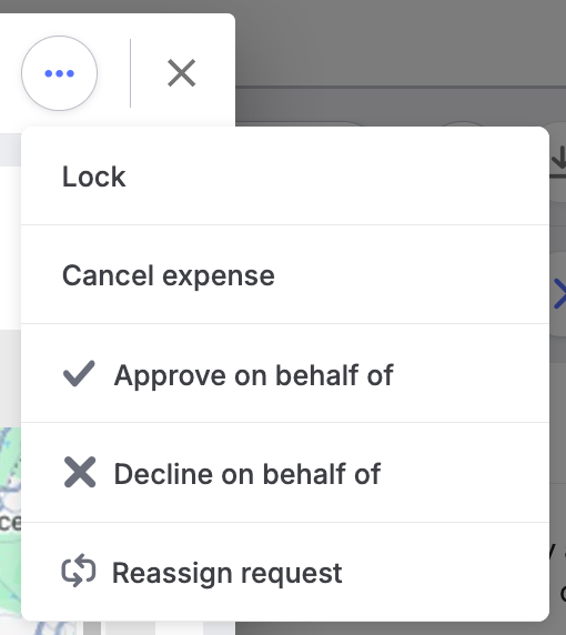 To take an action as an Administrator, click the 'In review' tab, use the filters to locate relevant expenses, click a specific request, navigate to the three dots in the upper right corner, and act.Â