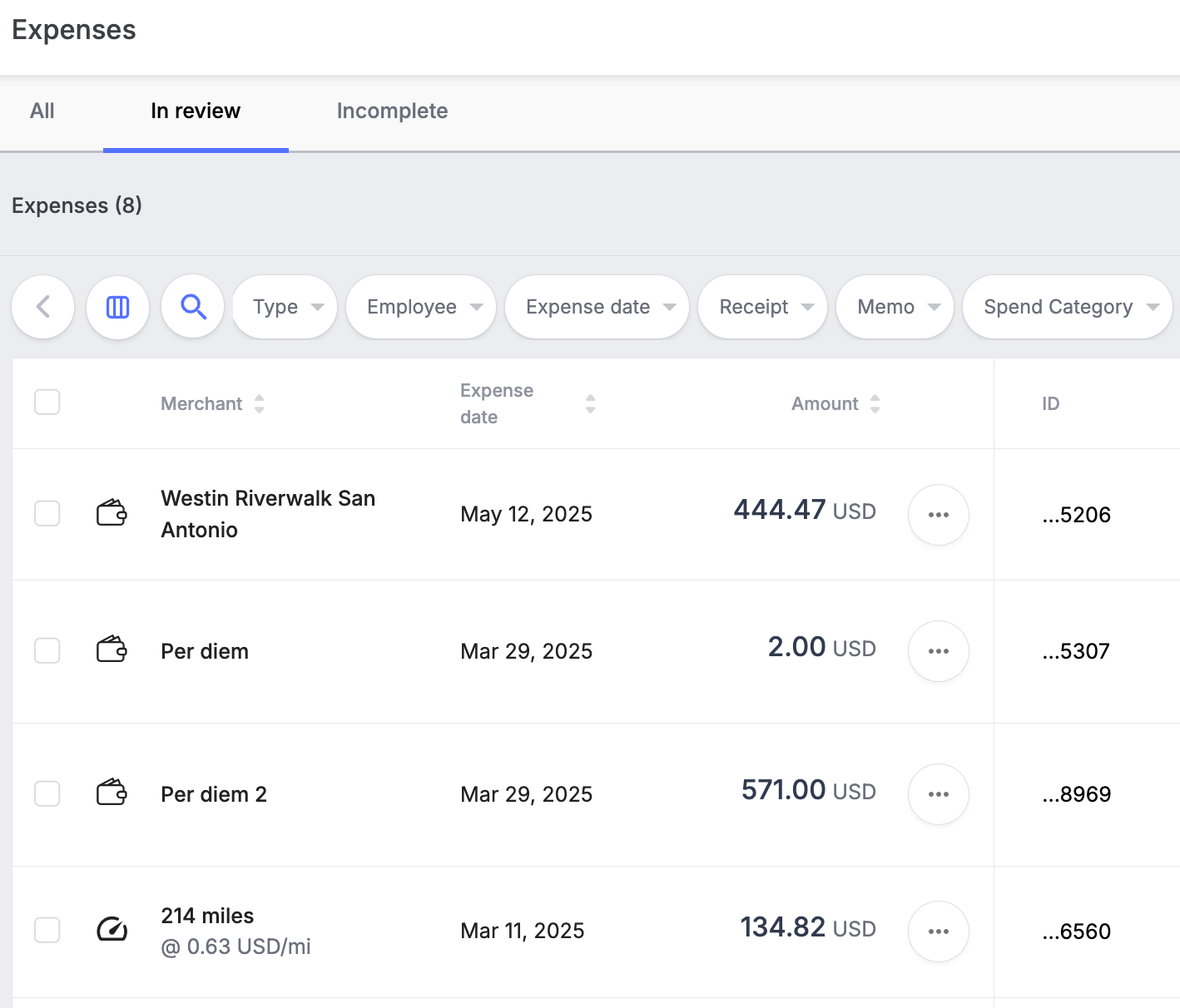 - All - includes all the entity's expenses in various statuses such as 'Pending', 'In Review', 'Declined', 'Approved', 'Paid', 'Canceled', etc.